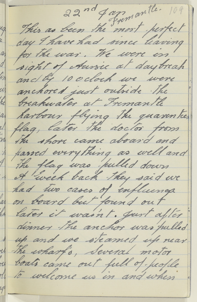 This as been the most perfect day I have had since leaving for the war. We were in sight of Aussie at day break and by 10 o clock we were anchored just outside the breakwater at Fremantle harbour flying the quarenteen flag, later the doctor from the shore came aboard and passed everything as well and the flag was pulled down. A week back they said we had two cases of enfluenza on board but found out later it was'nt. Just after dinner the anchor was pulled up and we steamed up near the wharf's. Several motor boats came out full of people to welcome us in and when