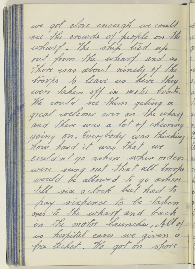 we got close enough we could see the crowds of people on the wharf. The ship tied up out from the wharf and as there was about ninety of the troops to leave us here they were taken off in motor boats. We could see them geting a great welcome over on the wharf and there was a lot of cheering going on. Everybody was thinking how hard it was that we could'nt go ashore when orders were sung out that all troops would be allowed to go ashore till six o clock but had to pay sixpence to be taken over to the wharf and back in the motor launches. All of us hospital cases we given a free ticket. We got on shore