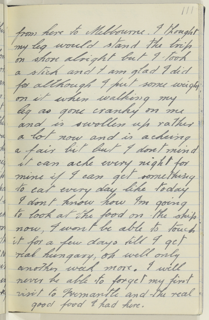 from here to Melbourne. I thought my leg would stand the trip on shore alright but I took a stick and I am glad I did for although I put some weight on it when walking my leg as gone cranky on me and is swollen up rather a lot now and is acheing a fair bit but I dont mind it can ache every night for mine if I can get something to eat every day like today. I dont know how Im going to look at the food on the ship now, I wont be able to touch it for a few days till I get real hungary, oh well only another week more. I will never be able to forget my first visit to Fremantle and the real good food I had here.