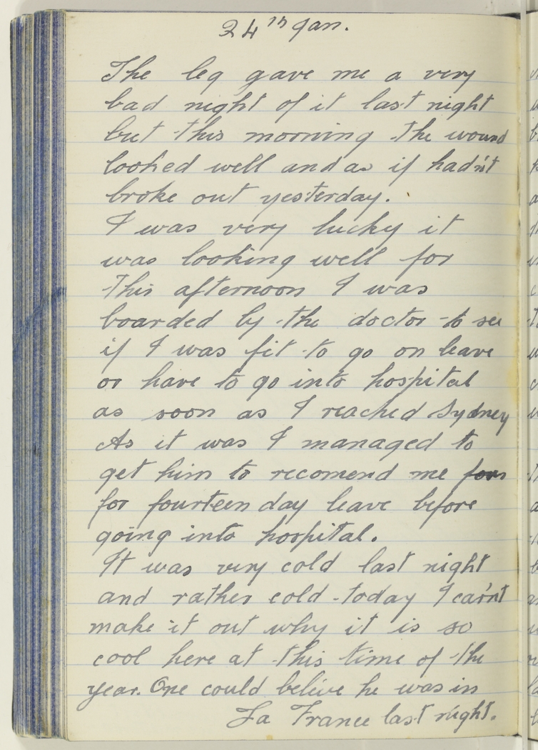 The leg gave me a very bad night of it last night but this morning the wound looked well and as if had'nt broke out yesterday. I was very lucky it was looking well for this afternoon I was boarded by the doctor to see if I was fit to go on leave or have to go into hospital as soon as I reached Sydney. As it was I managed to get him to recomend me four for fourteen day leave before going into hospital.