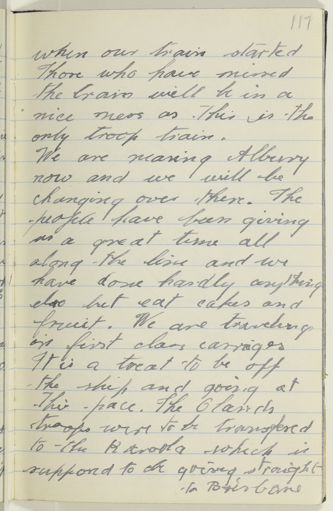 We are nearing Albury now and we will be changing over there. The people have been giving us a great time all along the line and we have done hardly anything else but eat cakes and fruit. We are traveling in first class carriages. It is a treat to be off the ship and going at this pace. The Qlands troops were to be transfered to the Karoola which is supposed to be going straight to Brisbane.