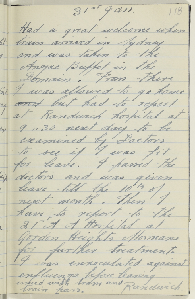 Had a great welcome when train arrived in Sydney and was taken to the Anzac Buffet in the Domain. From there I was allowed to go home and but had to report at Randwick hospital at 9.30 next day to be examined by Doctors to see if I was fit for leave. I passed the doctors and was given leave till the 10th of next month. Then I have to report to the 21st A.A. Hospital at Gordon Heights, Mosmans [Mosman] for further treatment.