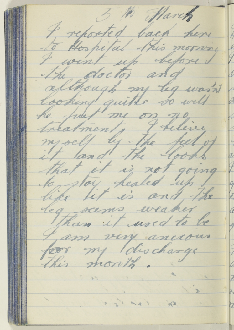 I reported back here to Hospital this morning. I went up before the doctor and although my leg was'nt looking quite so well he put me on no treatment. I beleive myself by the feel of it and the looks that it is not going to stay healed up like it is and the leg seems weaker than it used to be. I am very anxious for my discharge this month.