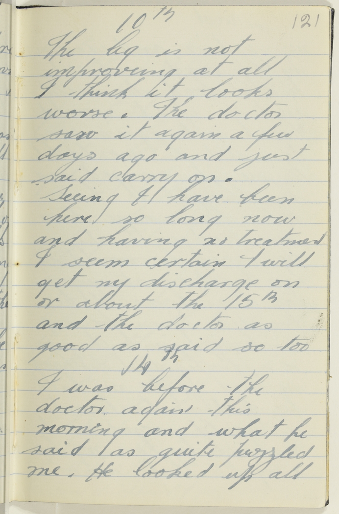 The leg is not improveing at all I think it looks worse. The doctor saw it again a few days ago and just said carry on. Seeing I have been here so long now and having no treatment I seem certain I will get my discharge on or about the 15th and the doctor as good as said so too.