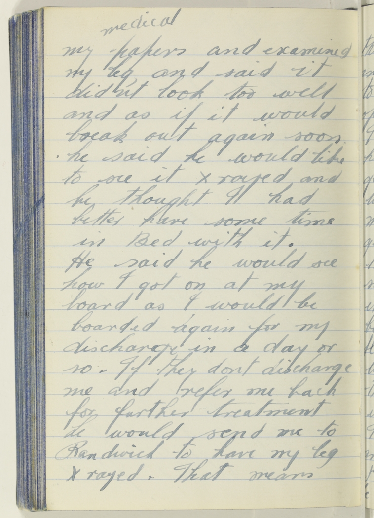 He said he would see how I got on at my board as I would be boarded again for my discharge in a day or so. If they dont discharge me and refer me back for further treatment he would send me to Randwick to have my leg X rayed. That means