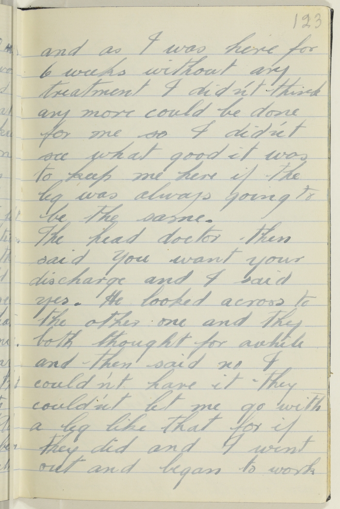 The head doctor then said, you want your discharge and I said yes. He looked across to the other one and they both thought for awhile and then said no I could'nt have it, they could'nt let me go with a leg like that for if they did and I went out and began to work