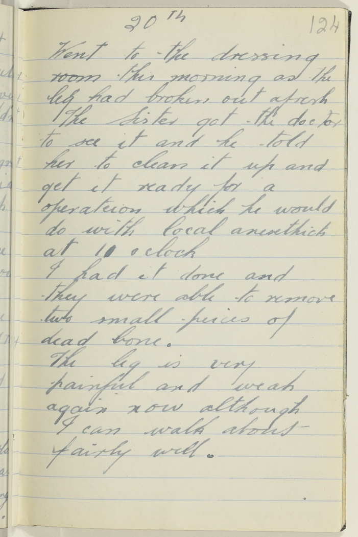 Went to the dressing room this morning as the leg had broken out afresh. The Sister got the doctor to see it and he told her to clean it up and get it ready for a operateion which he would do with local anesethicts at 11 o clock.