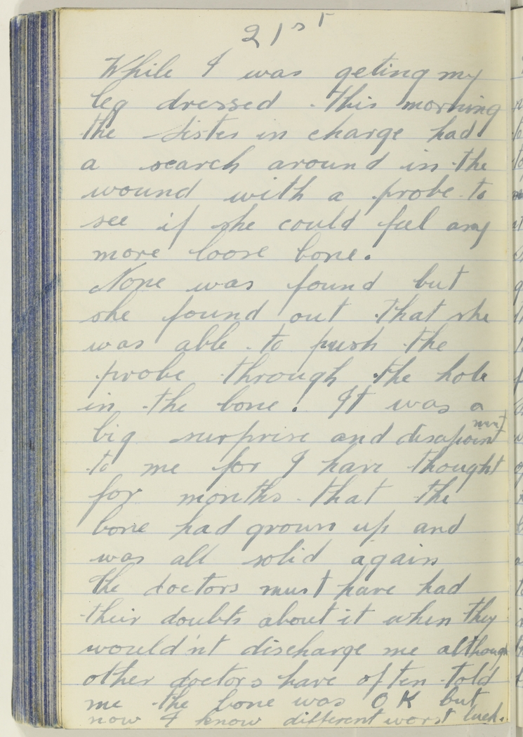 While I was geting my leg dressed this morning the Sister in charge had a search around in the wound with a probe to see if she could feel any more loose bone. None was found but she found out that she was able to push the probe through the hole in the bone. It was a big surprise and disapointment to me for I have thought for months that the bone had grown up and was all solid again. The doctors must have had their doubts about it when they would'nt discharge me although other doctors have often told me the bone was OK but now I know different worst luck.