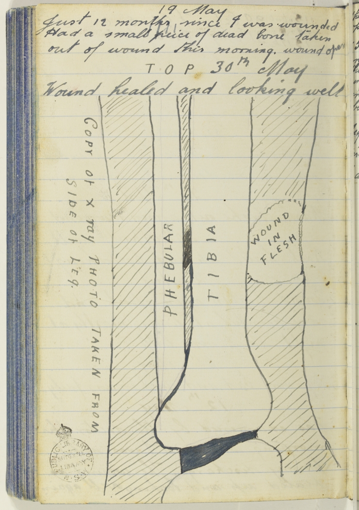 [See image for sketch with the comment "Copy of X ray photo taken from side of leg".]