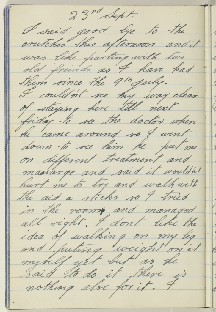 I couldn't see my way clear of staying here till next friday to see the doctor when he came around so I went down to see down to see him he put me on different treatment and massarge and said it wouldn't hurt me to try and walk with the aid a sticks so I tried in the room and managed all right.  I dont like the idea of walking on my leg and puting weight on it myself yet but as he said to do it, there is nothing else for it. I