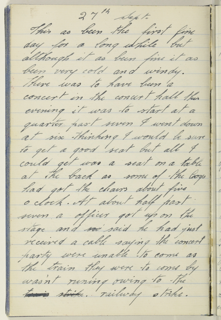There was to have been a concert in the concert hall this evening it was to start at a quarter past seven I went down at six thinking I would be sure to get a good seat but all I could get was a seat on a table at the back as some of the boys had got the chairs about five o clock. At about half past seven a officer got up on the stage and said he had just received a cable saying the concert party were unable to come as the train they were to come by was'nt runing owing to the train strike railway strike.