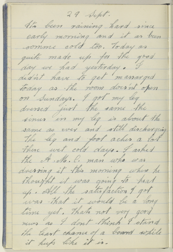 Its been raining hard since early morning and it as been somme cold too. Today as quite made up for the good day we had yesterday.  I did'nt have to get massarged today as the room does'nt open on Sundays. I got my leg dressed just the same, the sinus in my leg is about the same as ever and still dischargeing The leg and foot aches a lot these wet cold days.  I asked the A.M.C. man who was dressing it this morning when he thought it was going to heal up. All the satisfaction I got was that it would be a long time yet. Thats not very good news as I dont think I stand the least chance of a board while it keeps like it is.