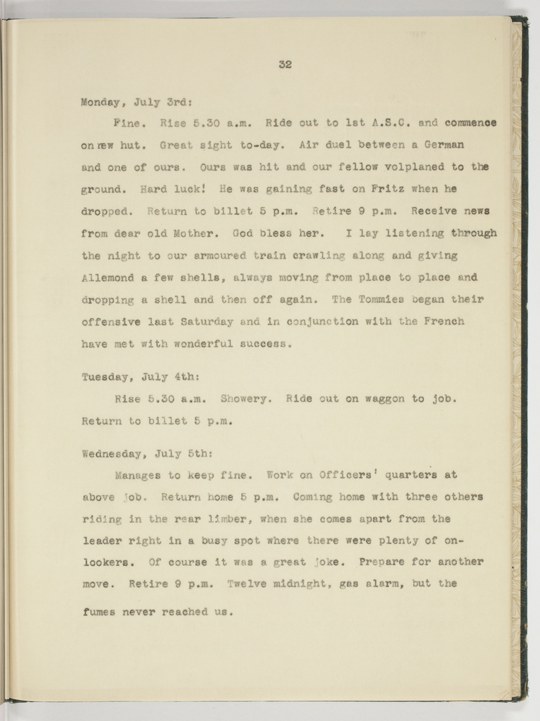 Fine. Rise 5.30 a.m. Ride out to 1st A.S.C. and commence on new hut. Great sight to-day. Air duel between a German and one of ours. Ours was hit and our fellow volplaned to the ground. Hard luck! He was gaining fast on Fritz when he dropped. Return to billet 5 p.m. Retire 9 p.m. Receive news from dear old Mother. God bless her. I lay listening through the night to our armoured train crawling along and giving Allemond a few shells, always moving from place to place and dropping a shell and then off again. The Tommies began their offensive last Saturday and in conjunction with the French have met with wonderful success.