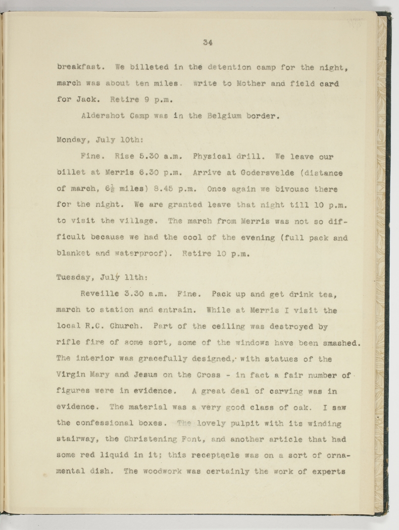 Reveille 3.30 a.m. Fine. Pack up and get drink tea, march to station and entrain. While at Merris I visit the local R.C. Church. Part of the ceiling was destroyed by rifle fire of some sort, some of the windows have been smashed. The interior was gracefully designed, with statues of the Virgin Mary and Jesus on the Cross – in fact a fair number of figures were in evidence. A great deal of carving was in evidence. The material was a very good class of oak. I saw the confessional boxes. The lovely pulpit with its winding stairway, the Christening Font, and another article that had some red liquid in it; this receptacle was on a sort of ornamental dish. The woodwork was certainly the work of experts