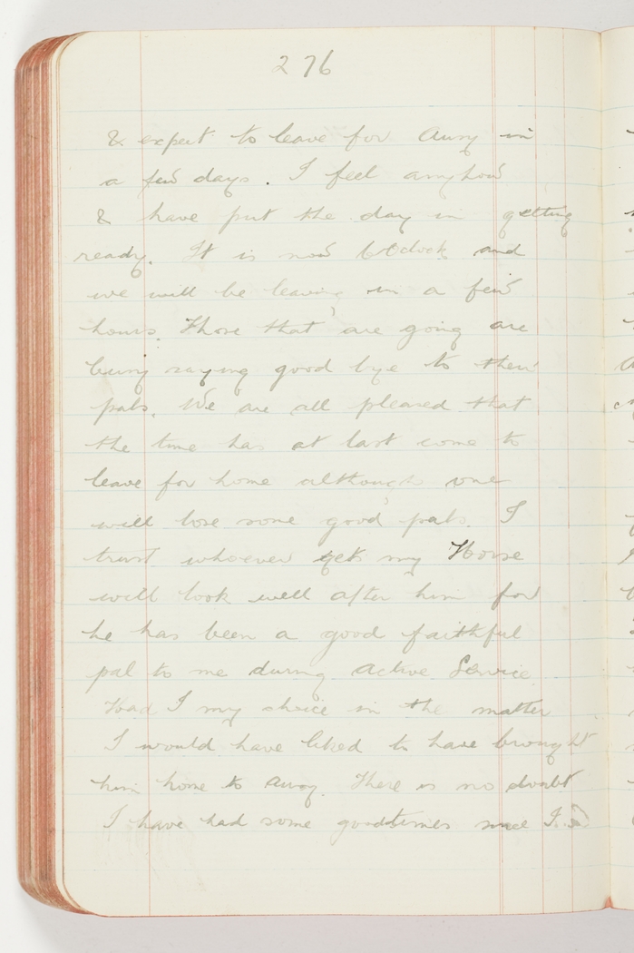 & expect to leave for Ausy in a few days. I feel anyhow & have put the day in getting ready. It is now 6Oclock and we will be leaving in a few hours. Those that are going are busy saying goodbye to their pals. We are all pleased that the time has at last come to leave for home although one will lose some good pals. I trust whoever gets my horse will look well after him for he has been a good faithful pal to me during Active Service. Had I my choice in the matter I would have liked to have brought him home to Ausy. There is no doubt I have had some good times since I