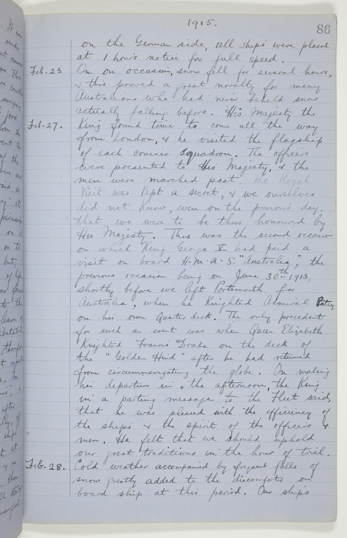 His Majesty the King found time to come all the way from London, & he visited the flagship of each cruiser squadron. The officers were presented to His Majesty, & the men were marched past. The Royal Visit was kept a secret, & we ourselves did not know, even on the previous day, that we were to be thus honoured by His Majesty. This was the second occasion on which King George V had paid a visit on board H.M.A.S. "Australia", the previous occasion being on June 30th. 1913, shortly before we left Portsmouth for Australia, when he Knighted Admiral Patey on his own Quarter deck. The only precedent for such an event was when Queen Elizabeth Knighted Francis Drake on the deck of the "Golden Hind" after he had returned from circumnavigating the globe. On making his departure in the afternoon, the King in a parting message to the Fleet said, that he was pleased with the efficiency of the ships & the spirit of the officers & men. He felt that we should uphold our great traditions in the hour of trial.