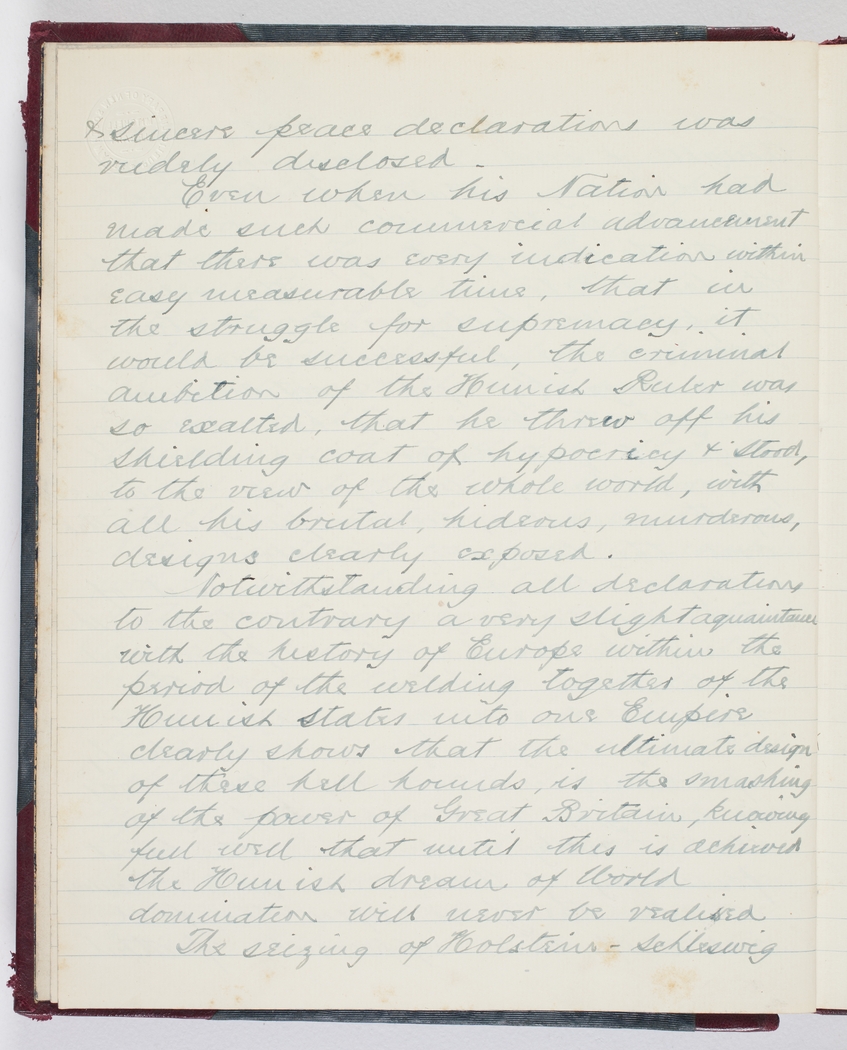 Even when his Nation had made such commercial advancement that there was every indication within easy measurable time, that in the struggle for supremacy, it would be successful, the criminal ambition of the Hunish Ruler was so exalted, that he threw off his shielding coat of hypocricy & stood, to the view of the whole world, with all his brutal, hideous, murderous, designs clearly exposed.