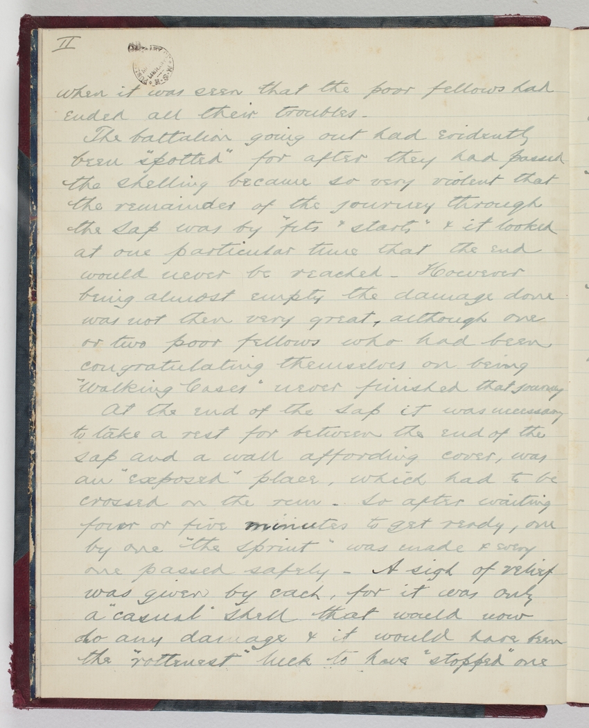 At the end of the Sap it was necessary to take a rest for between the end of the Sap and a wall affording cover, was an "exposed" place, which had to be crossed on the run. So after waiting four or five minutes to get ready, one by one "the sprint" was made & every one passed safely. A sigh of relief was given by each, for it was only a "casual" shell that would now do any damage & it would have been the "rottenest" luck to have "stopped" one of these at this part of the walk. Nine dressing stations in all had to be passed & at not one, could any attention be given on account of pressing cases demanding instant treatment.