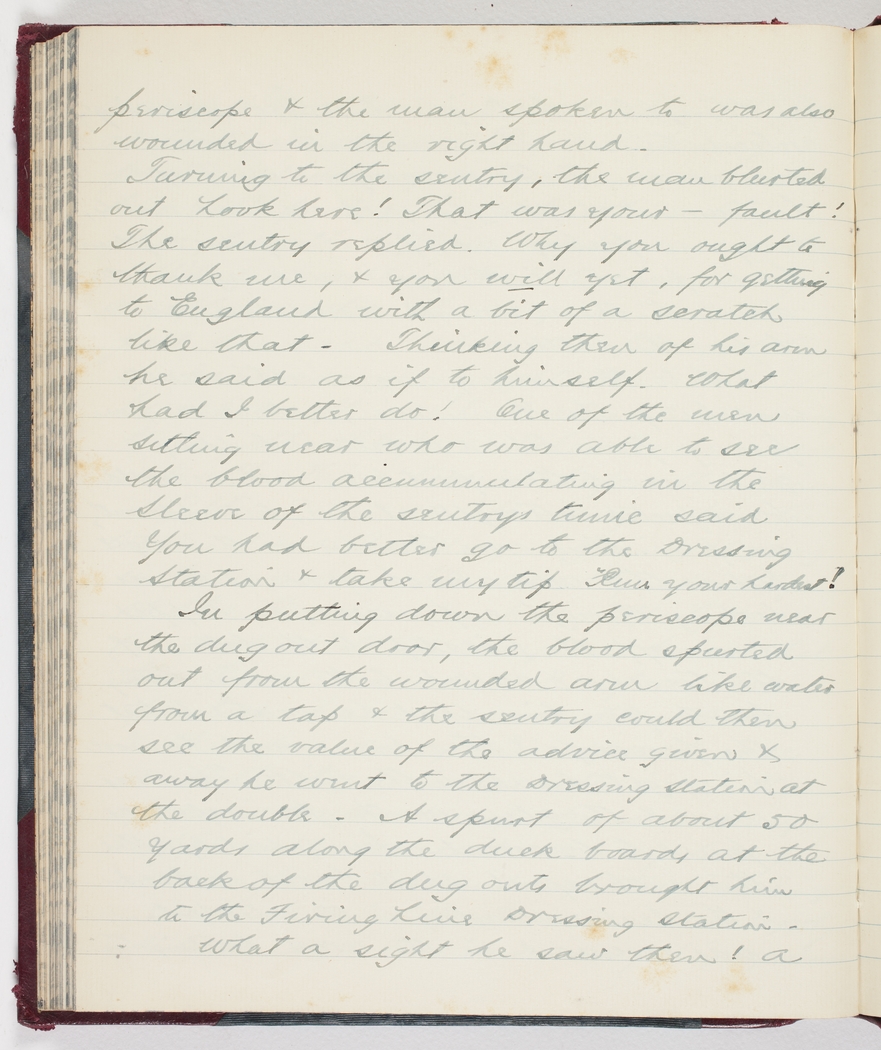 Turning to the sentry, the man blurted out Look here! That was your [dash] fault! The sentry replied. Why you ought to thank me, & you will yet, for getting to England with a bit of a scratch like that. Thinking then of his arm he said as if to himself. What had I better do!