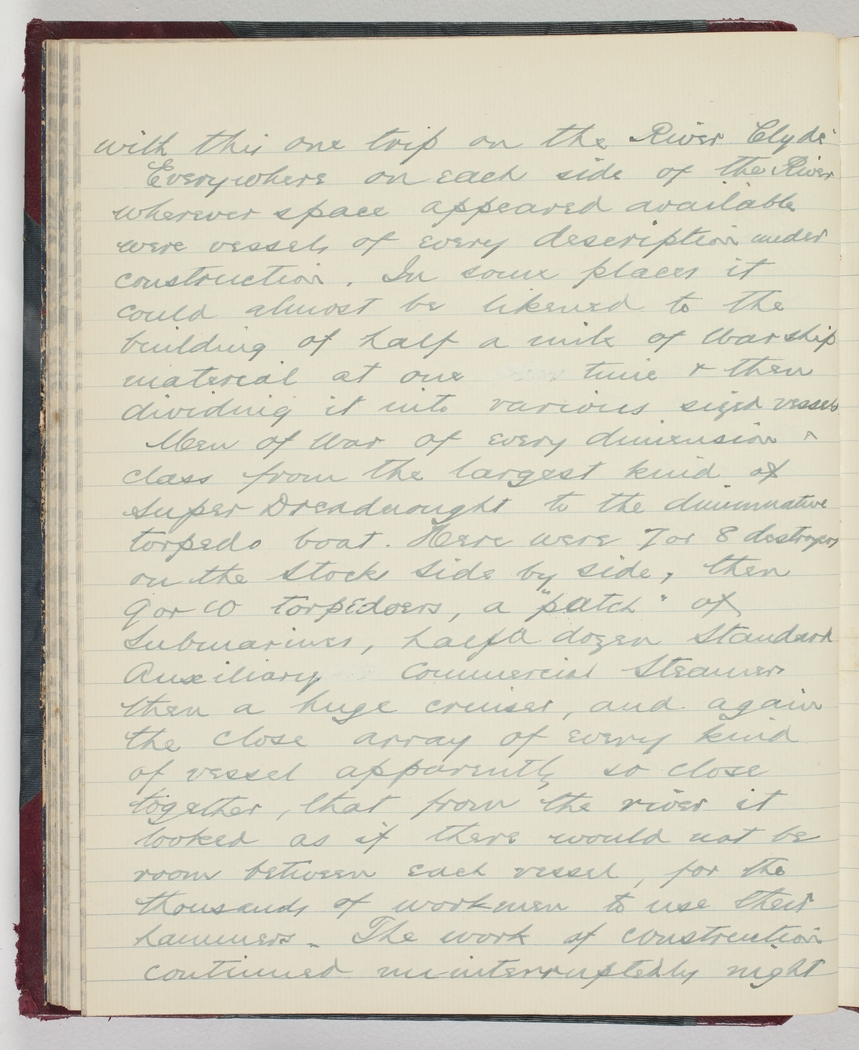 Men of War of every dimension & class from the largest kind of Super Dreadnought to the diminuative torpedo boat. Here were 7 or 8 destroyers on the stocks side by side, then 9 or 10 torpedoers, a "patch" of Submarines, half a dozen Standard Auxiliary Commercial Steamers then a huge cruiser, and again the close array of every kind of vessel apparently so close together, that from the river it looked as if there would not be room between each vessel, for the thousands of workmen to use their hammers. The work of construction continued un-interruptedly night and day, Sundays included.