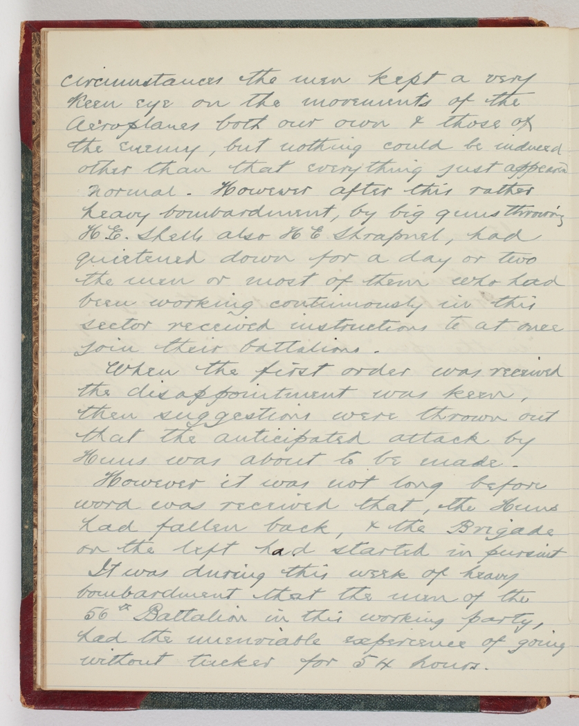 circumstances the men kept a very keen eye on the movements of the aeroplanes both our own & those of the enemy, but nothing could be induced other than that everything just appeared normal. However after this rather heavy bombardment, by big guns throwing H. E. Shells also H E Shrapnel, had quietened down for a day or two the men or most of them who had been working continuously in this sector received instructions to at once join their battalions.