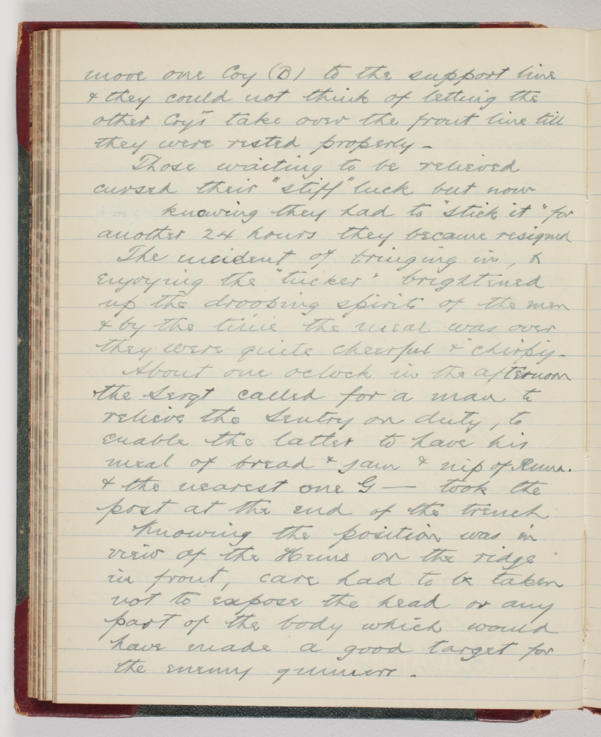 About one oclock in the afternoon the Sergt called for a man to relieve the Sentry on duty, to enable the latter to have his meal of bread & jam & nip of Rum. & the nearest one G[dash] took the post at the end of the trench