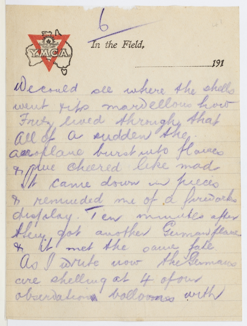 We could see where the shells went & its marvellous how Fritz lived through that. All of a sudden the aeroplane burst into flames & we cheered like mad. It came down in pieces & reminded me of a fireworks display. Ten minutes after they got another German plane & it met the same fate. As I write now the Germans are shelling at 4 of our observation balloons with