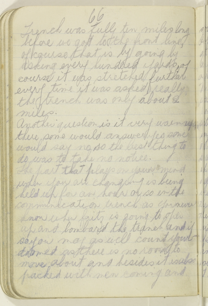 Trench was fully ten miles long before we got to the front line, of course that is by going by asking every hundred yards, of course it was stretched further every time it was asked, really the trench was only about 2 miles.