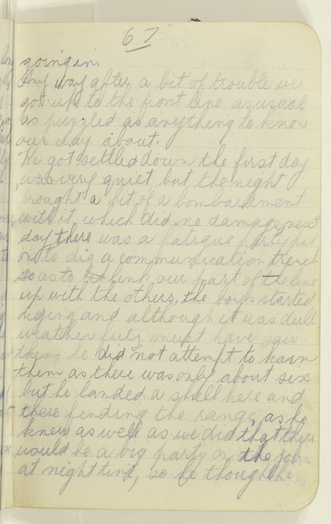 We got settled down the first day was very quiet but the night brought a bit of a bombardment with it which did no damage, next day there was a fatigue party put on to dig a communication trench so as tolik link our part of the line up with the others, the boys started diging and although it was dull weather fritz must have saw them, he did not attempt to harm them as there was only about six but he landed a shell here and there finding the range, as he knew as well as we did that there would be a big party on the job at night time, so he thought he