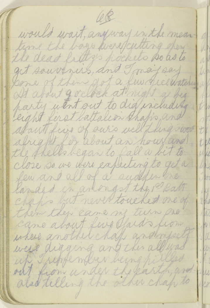would wait, anyway in the meantime the boy's were cutting open the dead fritz's pockets so as to get souvenirs, and I may say some of them got a few nice watches. At about 9 o'clock at night a big party went out to dig including eight first battalion chap's and about five of our's well things went alright for about an hour and the shells began to fall a bit to close so we were expecting to get a few and all of a sudden one landed in amongst the 1st Batt. chap's but never touched one of them then came my turn one came about five yard's from where another chap and myself were digging and then all was up I remember being pulled out from under the earth, and also telling the other chap to