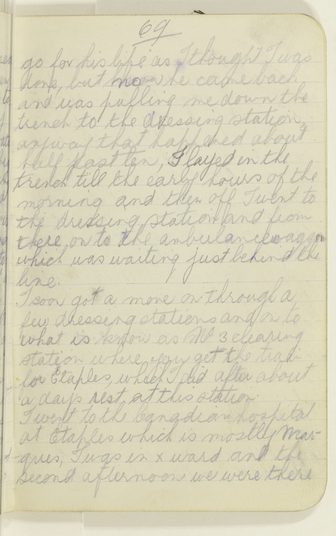 go for his life as I thought I was done, but no he came back and was pulling me down the trench to the dressing station, anyway that happened about half past ten, I layed in the trench till the early hours of the morning and then off I went to the dressing station and from there on to the ambulance waggon which was waiting just behind the line.
