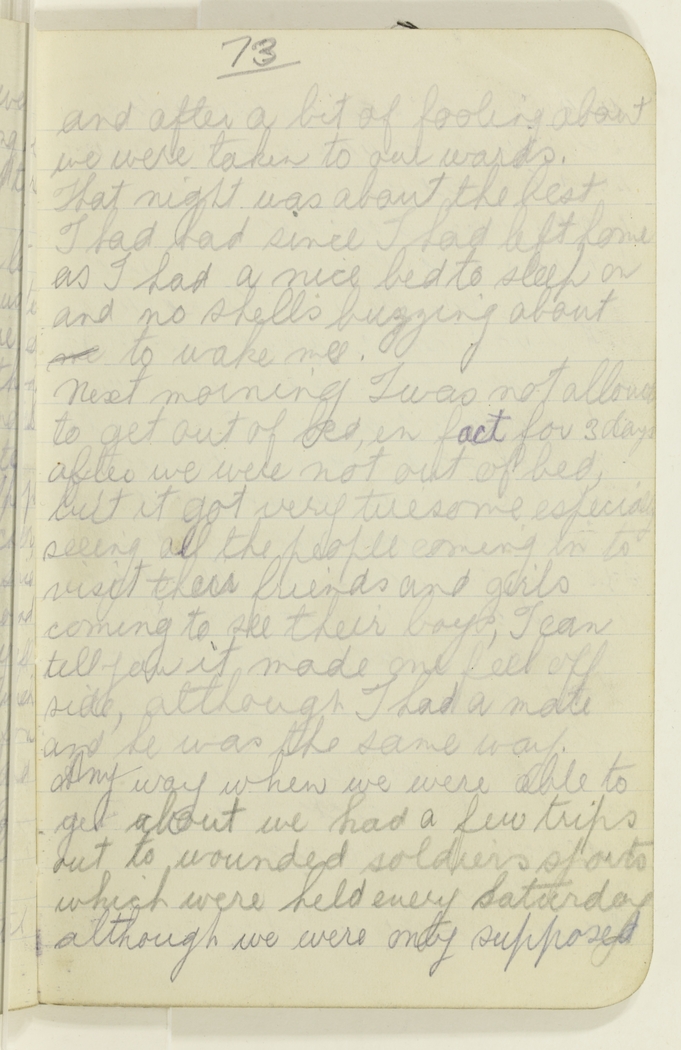 Next morning I was not allowed to get out of bed, in fact for 3 days after we were not out of bed, but it got very tiresome especially seeing all the people coming in to visit their friends and girls coming to see their boys, I can tell you it made one feel off side, although I had a mate and he was the same way.