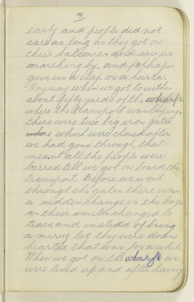 early and people did not care as long as they got on their balconies and saw us marching by, and perhaps give us a clap or a hurra. Anyway when we got to within about fifty yards of the wharfe where the transport was laying, there were two big iron gateswhere which were closed after we had gone through, that meant all the people were barred till we got on board the transport. Before we went through the gates there was a sudden change in the boys as their smiles changed to tears, and instead of being a merry lot they were down hearted that was for a while. When we got on the wharf we were lined up and after having