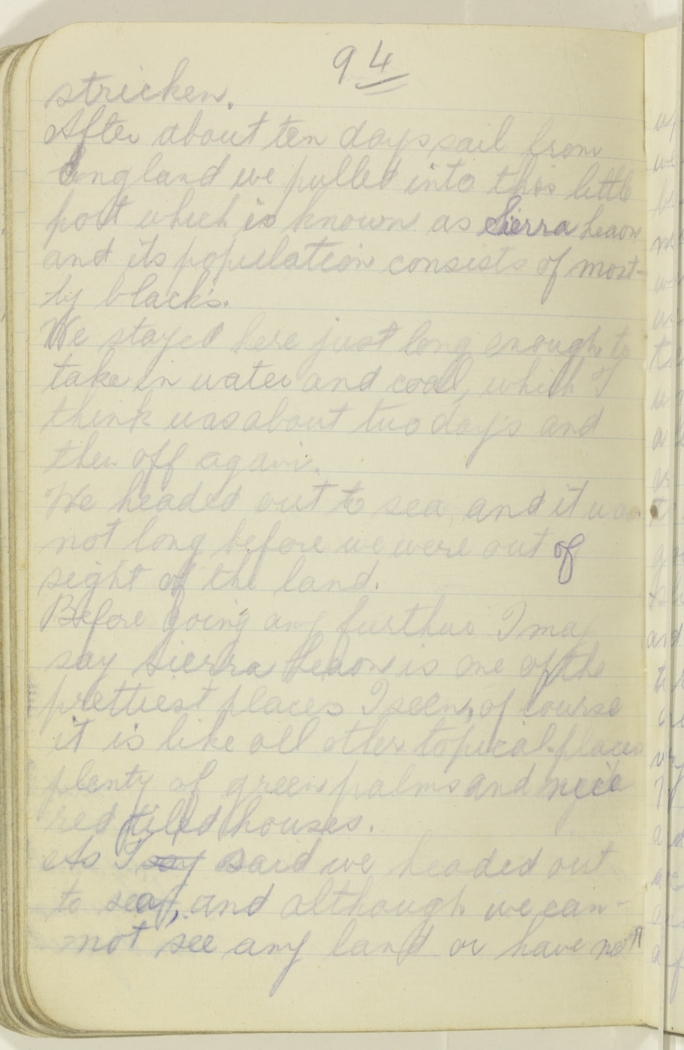 After about ten days sail from England we pulled into this little port which is known as Sierra Leaon and its population consists of mostly black's.