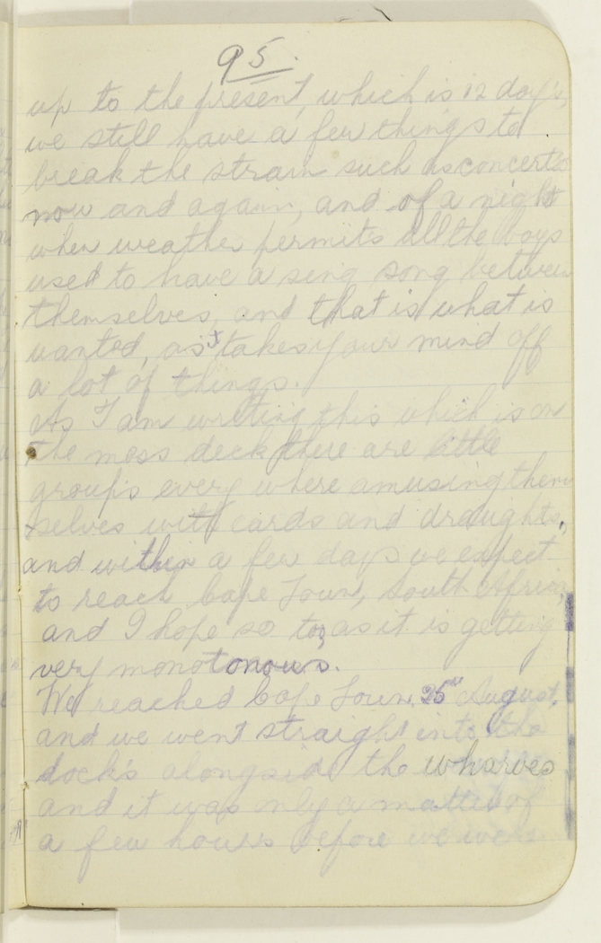 As I am writing this which is on the mess deck there are little group's every where amusing themselves with cards and draughts, and within a few days we expect to reach Cape Town, South Africa, and I hope so too, as it is getting very monotonous.