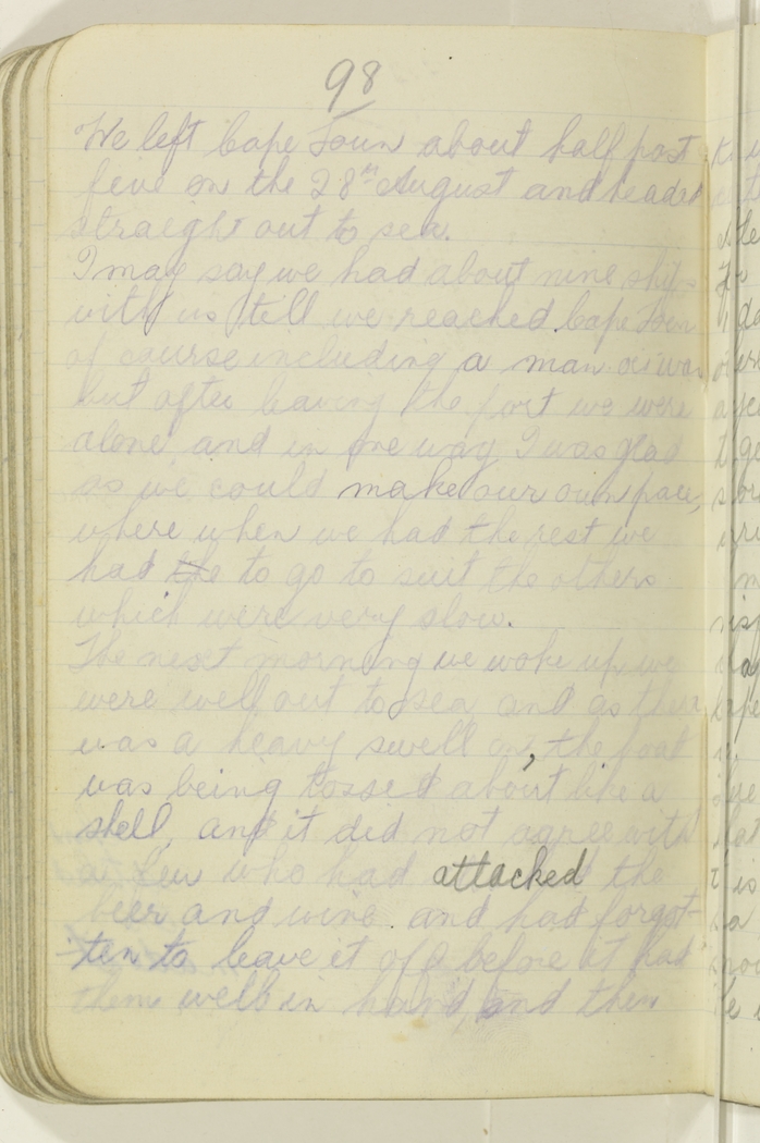 I may say we had about nine ships with us till we reached Cape Town of course including a man o'war but after leaving the port we were alone, and in one way I was glad as we could make our own pace, where when we had the rest we had the to go to suit the others which were very slow.