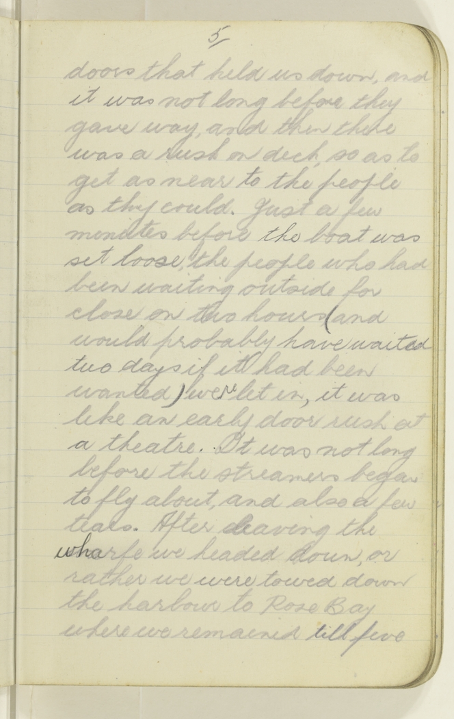 doors that held us down, and it was not long before they gave way, and then there was a rush on deck, so as to get as near to the people as they could. Just a few minutes before the boat was set loose, the people who had been waiting outside for close on two hours (and would probably have waited two days if it had been wanted) were let in, it was like an early door rush at a theatre. It was not long before the streamers began to fly about, and also a few tears. After leaving the wharfe we headed down or rather we were towed down the harbour to Rose Bay where we remained till five