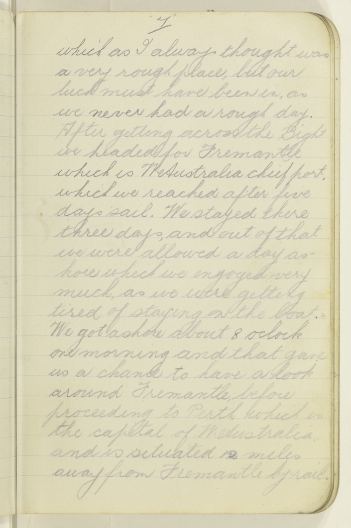 which as I always thought was a very rough place, but our luck must have been in, as we never had a rough day. After getting across the Bight we headed for Fremantle which is W. Australia chief port, which we reached after five days sail. We stayed there three days, and out of that we were allowed a day ashore which we enjoyed very much, as we were getting tired of staying on the boat. We got ashore about 8 oclock one morning and that gave us a chance to have a look around Fremantle, before proceeding to Perth which is the capital of the W. Australia and is situated 12 miles away from Fremantle by rail.