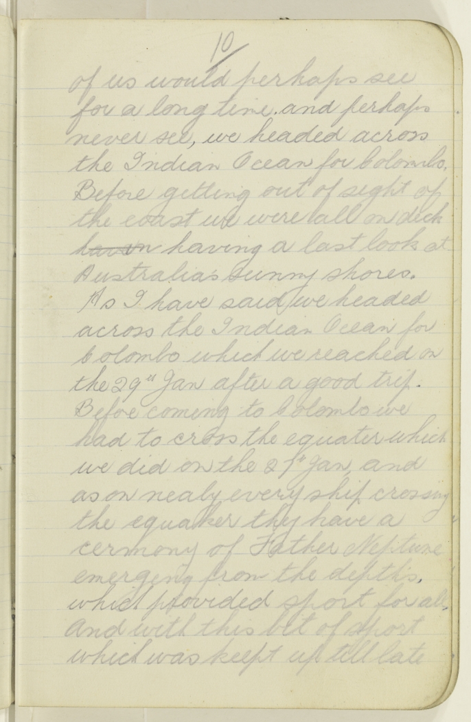 of us would perhaps see for a long time and perhaps never see, we headed across the Indian Ocean for Colombo. Before getting out of sight of the coast we were all on deckhavin having a last look at Australia's sunny shores. As I have said we headed across the Indian Ocean for Colombo which we reached on the 29th Jan after a good trip. Before coming to Colombo we had to cross the equater which we did on the 27th Jan, and as on nealy every ship crossing the equaker they have a cermony of Father Neptune emerging from the depth's, which provided sport for all, and with this bit of sport which was kept up till late