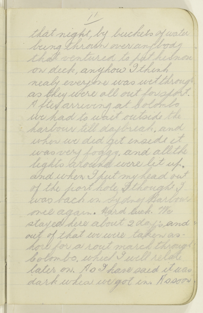 that night, by buckets of water being thrown over anybody that ventured to put his nose on deck, anyhow I think nealy everyone was wet through as they were all out for sport. After arriving at Colombo we had to wait outside the harbour till day break, and when we did get inside it was very foggy, and all the lights around were lit up, and when I put my head out of the port hole I thought I was back in Sydney Harbour once again. Hard luck. We stayed here about 2 day's, and out of that we were taken ashore for a rout march through Colombo, which I will relate later on. As I have said it was dark when we got in. As soon