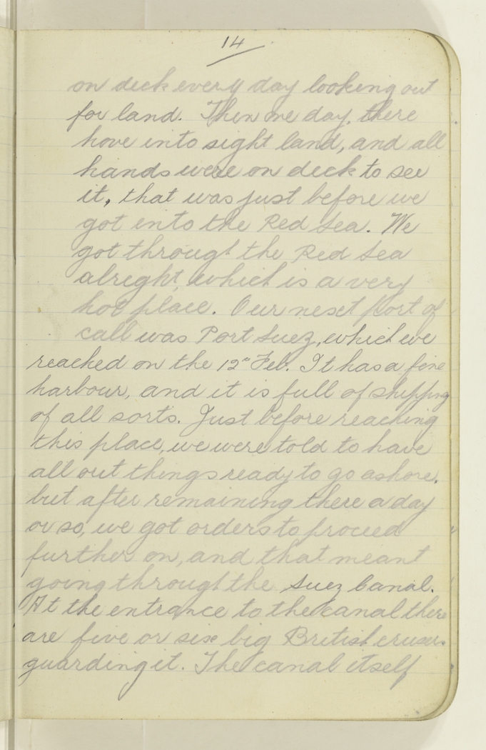 on deck every day looking out for land. Then one day, there hove into sight land, and all hands were on deck to see it, that was just before we got into the Red Sea. We got through the Red Sea alright, which is a very hot place. Our next port of call was Port Suez, which we reached on the 12th Feb. It has a fine harbour, and it is full of shipping of all sorts. Just before reaching this place, we were told to have all out things ready to go ashore, but after remaining there a day or so, we got orders to proceed further on, and that meant going through the Suez Canal. At the entrance to the canal there are five or six big British cruisers guarding it. The canal itself