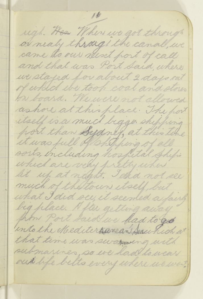 righ. Wen When we got through or nealy through the canal, we came to our next port of call and that was Port Said, where we stayed for about 2 days out of which we took coal and stores on board. We were not allowed ashore at this place. The port itself is a much bigger shipping port than Sydney, at this time it was full of shipping of all sorts, including hospital Ship's which are very pretty when lit up at night. I did not see much of the town itself, but what I did see, it seemed a fairly big place. After getting away from Port Said we had to go into the Mediterranean Sea which at that time was swarming with submarines, so we had to wear our life belts every where we went.