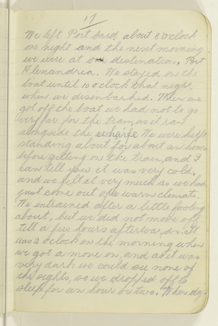 We left Port Said about 8 o'clock one night and the next morning we were at our destination, Port Alexandria. We stayed on the boat until 10 o'clock that night, when we disinbarked. When we got off the boat we had not to go very far for the train, as it ran alongside the wharfe. We were kept standing about for about an hour before getting on the train, and I can tell you it was very cold, and we felt it very much as we had just come out of a warm climate. We entrained after a little fooling about, but we did not move off till a few hour's afterwards. It was 2 o'clock in the morning when we got a move on, and as it was very dark we could see none of the sights, so we dropped off to sleep for an hour or two. When day