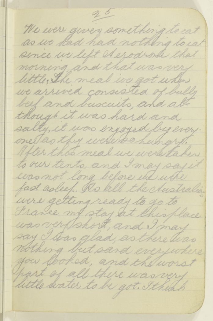 We were given something to eat as we had had nothing to eat since we left Aerodrome that morning, and that was very little. The meal we got when we arrived consisted of bully beef and buscuits, and although it was hard and salty, it was enjoyed by everyone as they were so hungry. After that meal we were taken to our tents, and I may say it was not long before we were fast asleep. As all the Australians were getting ready to go to France my stay at this place was very short, and I may say I was glad, as there was nothing but sand everywhere you looked, and the worst part of all there was very little water to be got. I think