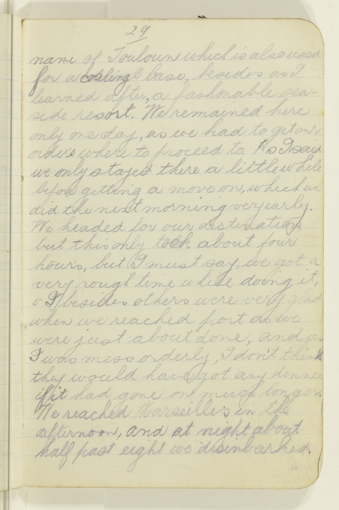 name of Toulon which is also used for a coaling base, besides as I learned after, a fashonable seaside resort. We remained here only one day, as we had to get our order's where to proceed to. As I said we only stayed there a little while before getting a move on, which we did the next morning very early. We headed for our destination, but this only took about four hour's, but I must say, we got a very rough time while doing it. I besides others were very glad when we reached port as we were just about done, and as I was mess orderly, I don't think they would have got any dinner if it had gone on much longer. We reached Marseilles in the afternoon, and at night about half past eight we disinbarked.