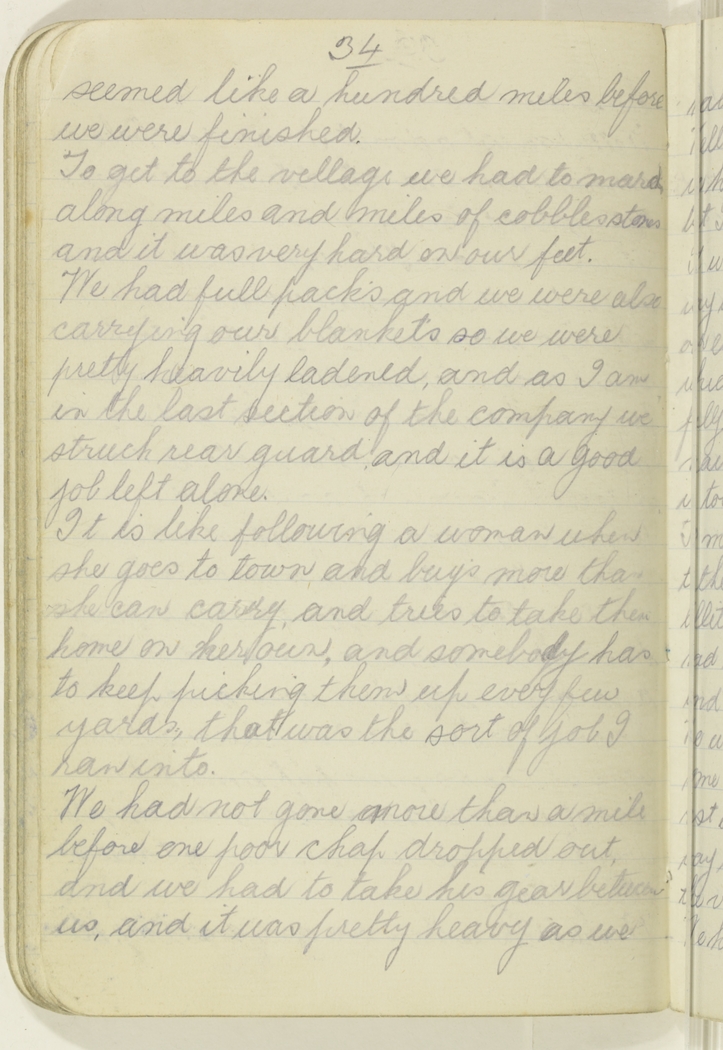 To get to the village we had to march along miles and miles of cobbles stones and it was very hard on our feet. We had full pack's and we were also carrying our blankets so we were pretty heavily ladened, and as I am in the last section of the company we struck rear guard, and it is a good job left alone.
