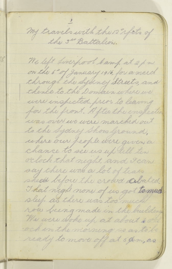 We left Liverpool Camp at 2 pm on the 6th January 1916, for a march through the Sydney Streets, and thence to the Domain where we were inspected prior to leaving for the front. After the inspection was over we were marched out to the Sydney Show Ground, where our people were given a chance to see us up till ten o'clock that night, and I can say there was a lot of tears shed before the crowd abated. That night none of us got to much sleep as there was too much row being made in the building. We were woke up at about 4 o'clock in the morning so as to be ready to move off at 5 am, as