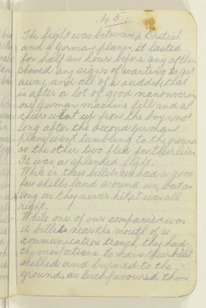 The fight was between 4 British and 4 German planes, it lasted for half an hour before any of them showed any sign's of wanting to get away, and all of a sudden, that is after a lot of good manouvering one German machine fell and a cheer went up from the boys, not long after the second German plane went tumbling to the ground so the other two fled for their lives. It was a splendid fight.