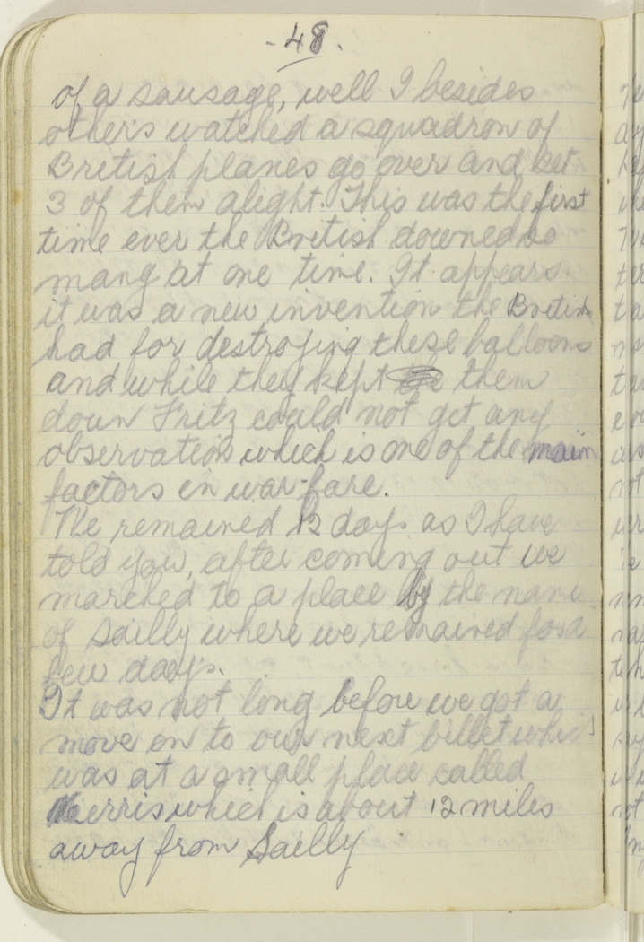 of a sausage, well I besides other's watched a squadron of British planes go over and set 3 of them alight. This was the first time ever the British downed so many at one time. It appears it was a new invention the British had for destroying these balloons and while they keptthe them down Fritz could not get any observation which is one of the main factors in war-fare.