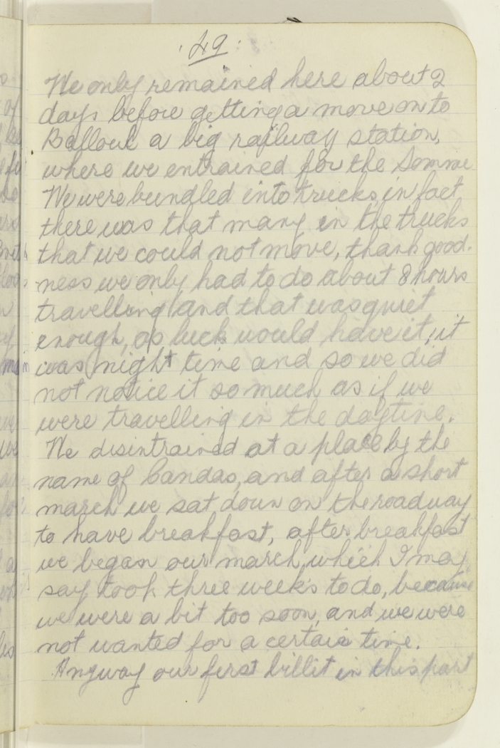 We only remained here about 2 days before getting a move on to Balloul a big railway station, where we entrained for the Somme. We were bundled into trucks in fact there was that many in the trucks that we could not move, thank goodness we only had to do about 8 hours travelling and that was quiet enough, as luck would have it, it was night time and so we did not notice it so much as if we were travelling in the daytime. We disintrained at a place by the name of Candas, and after a short march we sat down on the roadway to have breakfast, after breakfast we began our march, which I may say took three week's to do, because we were a bit too soon, and we were not wanted for a certain time.